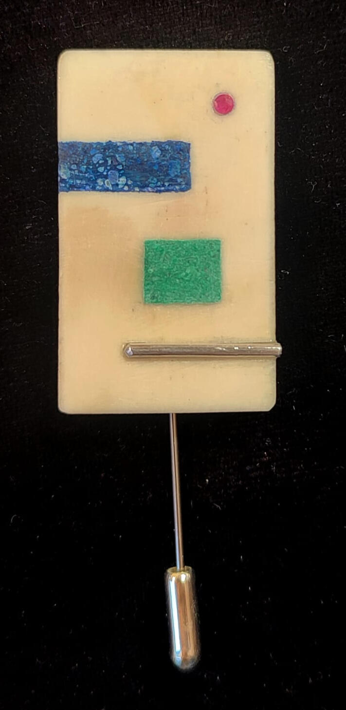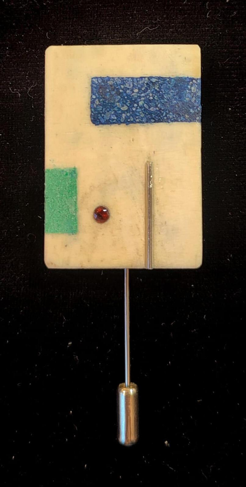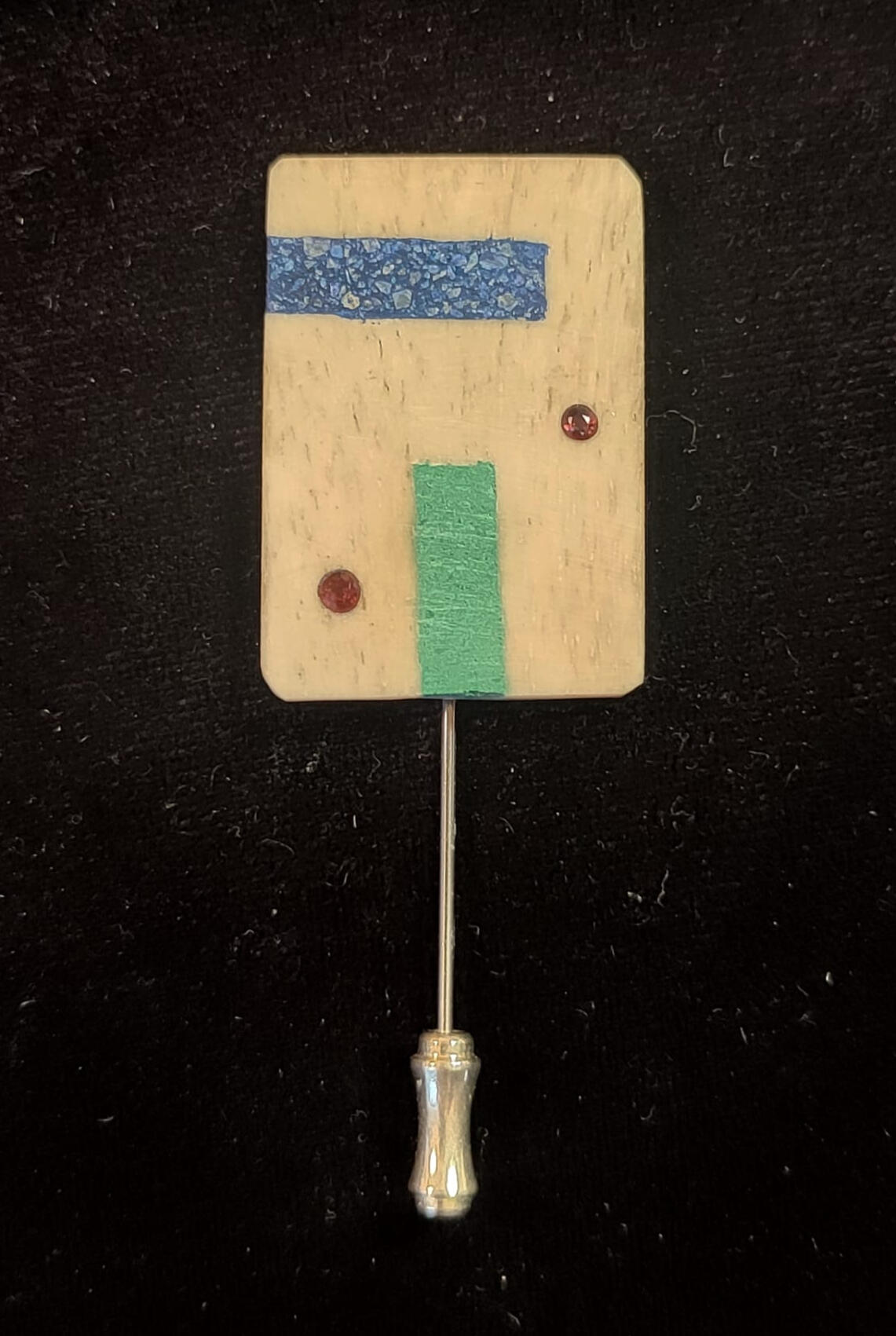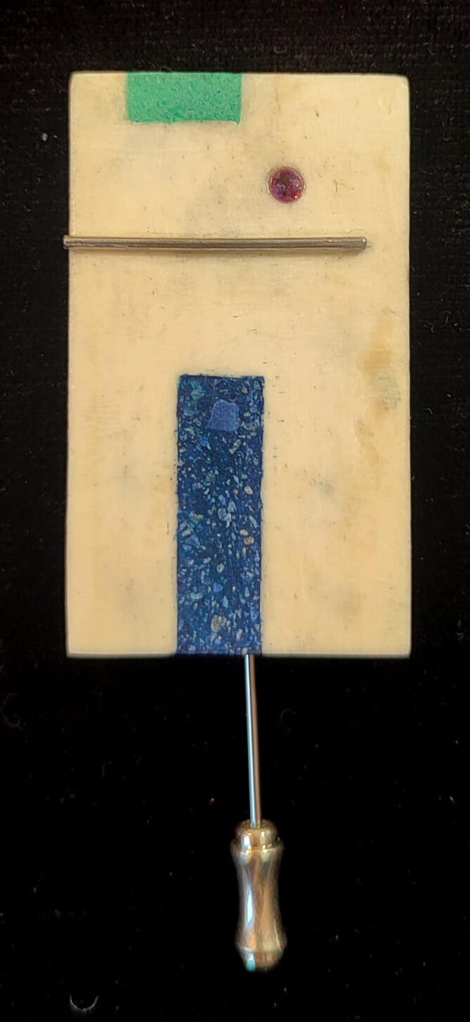 Bone base, with concrete and silver panels and ebony dot. Long steel pin and fixer descending from back.