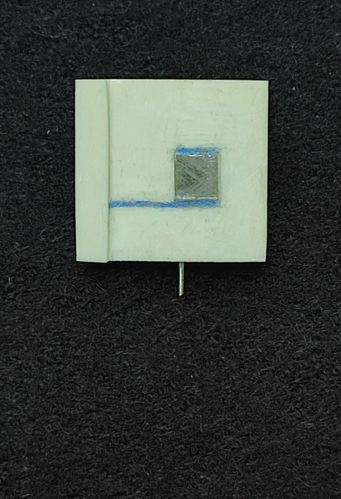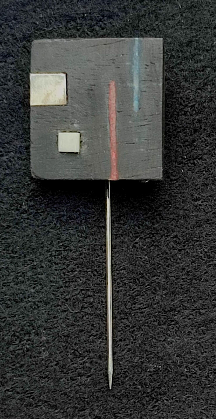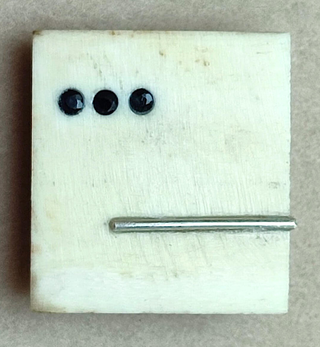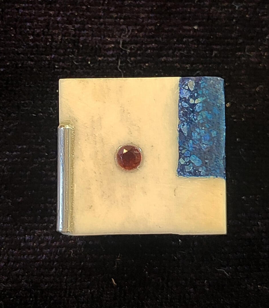 Bone base, with concrete and silver panels and ebony dot. Long steel pin and fixer descending from back.