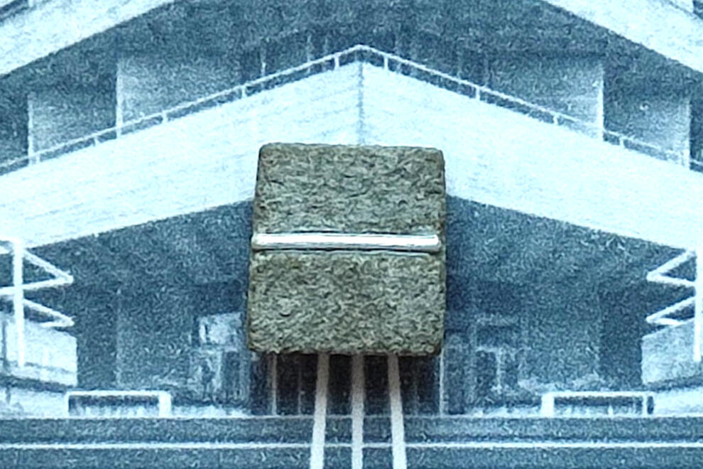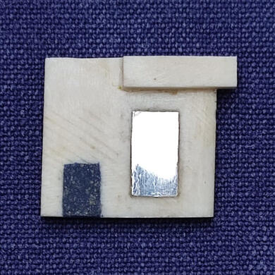 Bone base, with concrete and silver panels. Long steel pin and fixer descending from back. Torres-Garcia and Constructivist influence.